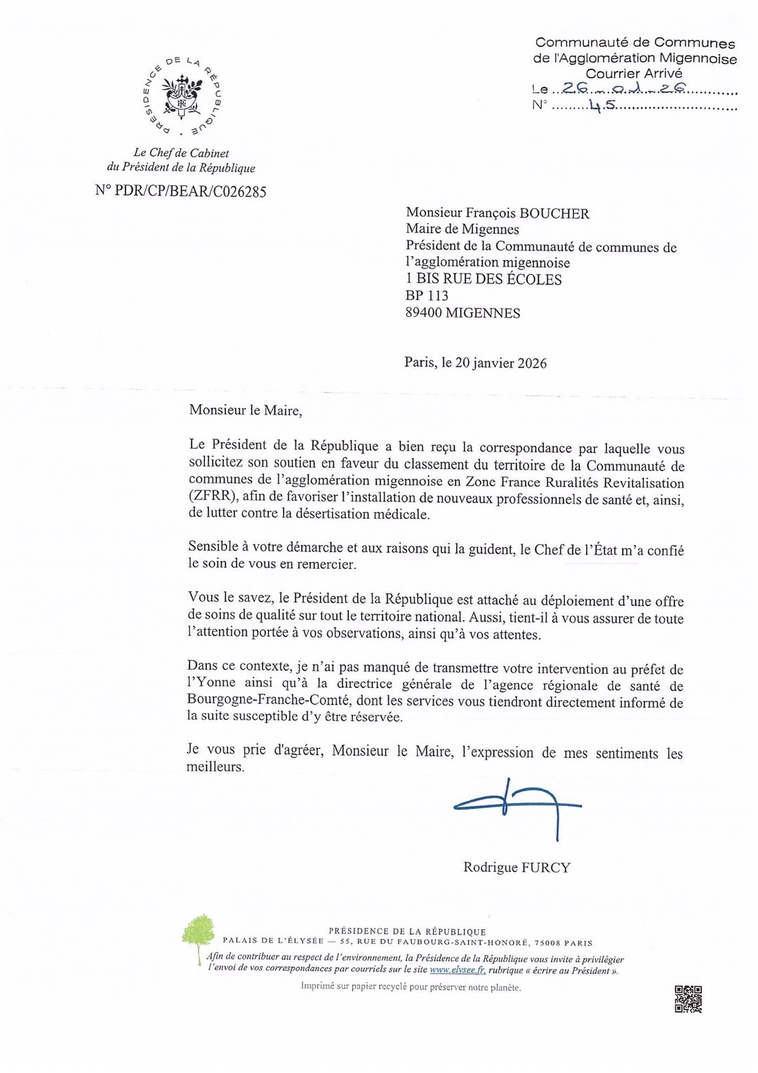 Suite à l’intervention déterminée de la mairie de Migennes afin d’obtenir le déclassement de notre territoire en ZFRR, le Président de la République par son chef de cabinet vient de nous adresser un courrier officiel.